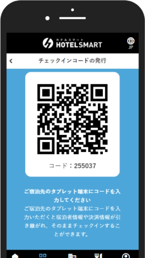 ホテル1階に設置されているチェックインタブレットをご利用ください。取得したQRコードをタブレットにかざすだけで、簡単にチェックイン手続きが完了します。操作方法がご不明な場合は、お気軽にスタッフまでお声かけください。