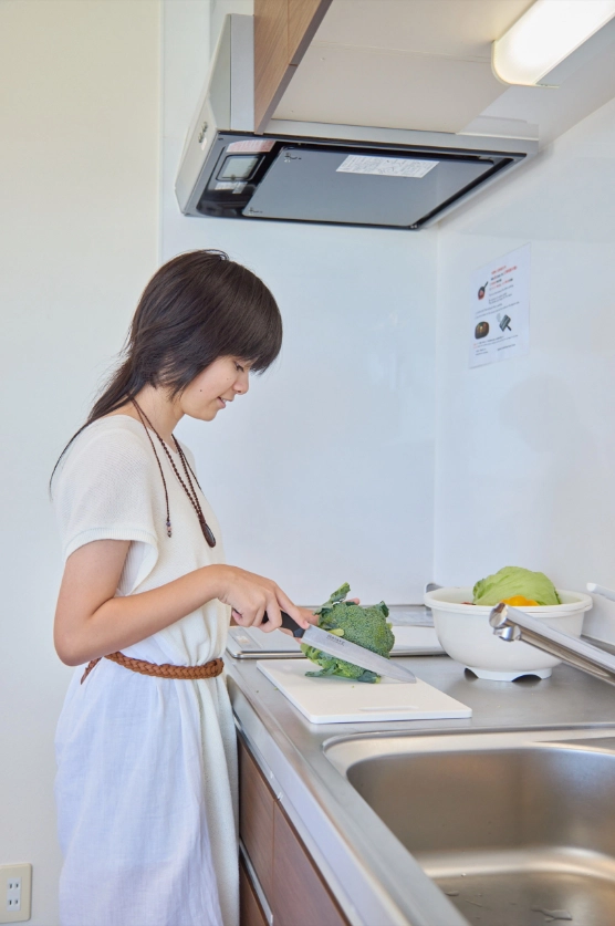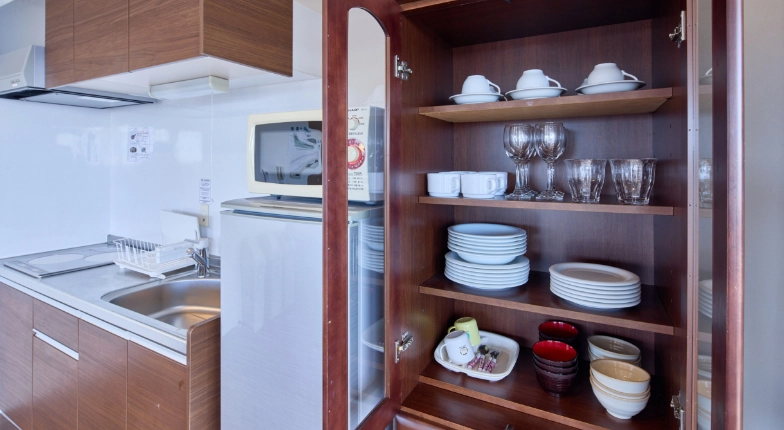 本格的なキッチン設備で、地元の新鮮な食材を使った料理をお楽しみください。冷蔵庫、電子レンジ、調理器具まで完備し、まるで自宅のように自由な食生活が可能です。