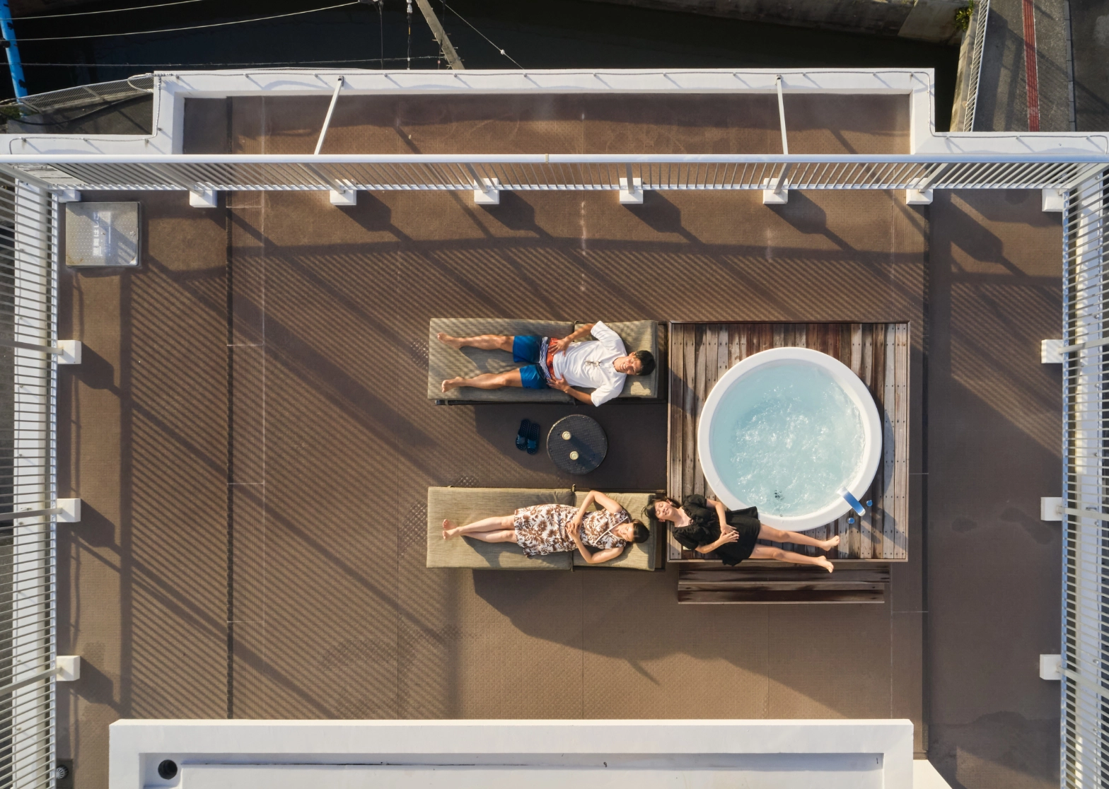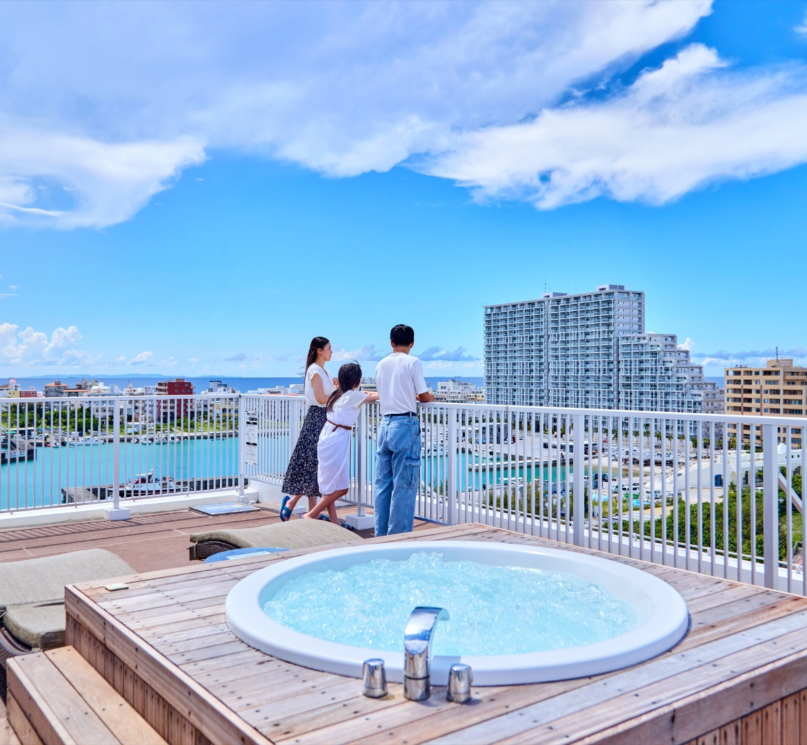 最上階ファミリールームの屋上テラスで、美しいサンセットを眺めながらのジャグジータイム。ヨットハーバーの絶景と共に、家族だけの贅沢なひとときをお過ごしください。