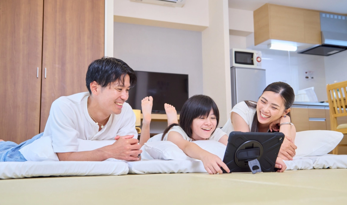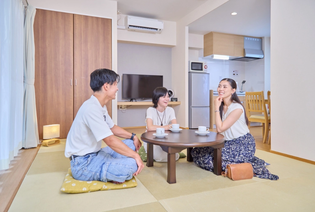 和室なら4名まで、ファミリールームなら最大6名まで一つの部屋で宿泊可能。小さなお子様がいるご家族も、仲の良いグループも、みんなで同じ空間を共有できる安心感があります。キッチンや洗濯機も完備しているので、長期滞在でも快適にお過ごしいただけます。